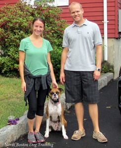 Chris and Diane with their Boxer "Sydney" - Off-Leash Obedience Training and Behavior Modification -"We couldn't be happier with Mike's training program. Individual sessions at your choice of venue makes it ideal. each session is an hour, but if it runs over Mike will stay until needed. He not only tells you what you need to do, but also explains in detail the purpose of why. I would highly recommend Mike's training to anyone looking for a trainer." - Christopher Dineen. Wakefield, MA