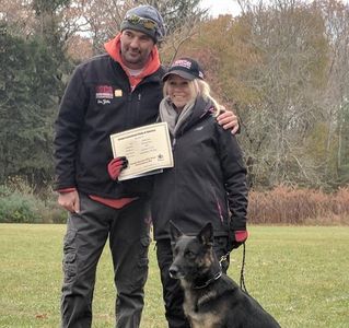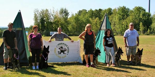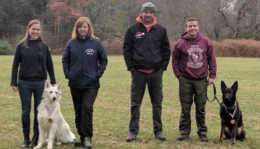 Mike's coaching pays off!!! AJ and "Jake" - Tammy and "Dino" - Rhonda and "Bullet" - Diane and "Lola" - Tom and "Max" all achieved their BH titles at Merrimack Valley Working Dog Club.